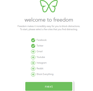 To start out select a couple of sites you would like to try blocking or choose 'Block Everything' to block the entire internet. You can select sites by clicking on the '+' button beside them or deselect by clicking on the check mark. Once you have selected the sites you want blocked, click 'next'.