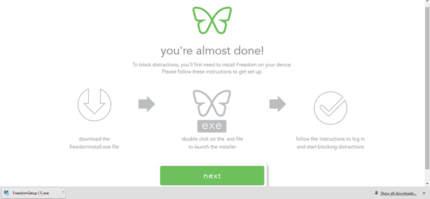 You will now be prompted to download and install the Freedom client onto your device. This page will automatically begin a download of the installer, depending on your browser it will show up at the bottom of your screen or in your 'Downloads' folder. Double click on the installer (FreedomSetup.exe if on Windows, FreedomSetup.dmg if on Mac) to begin and follow the instructions to install the Freedom client. You will need to log in to the Freedom client with your account.