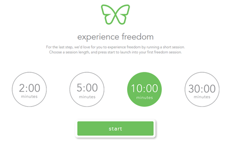 Finally to see Freedom's functionality you will be able to start a quick session with the sites you selected to be blocked. Select the amount of time for the session and click 'start'. This will begin blocking the sites you had selected on the previous page.
